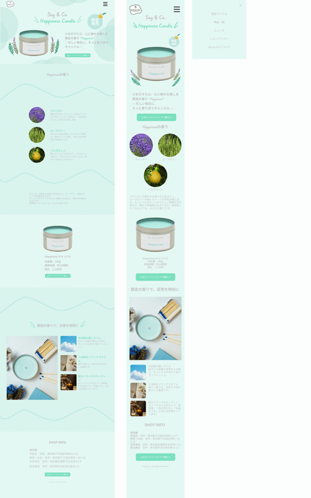 ・商品の世界観を広く見せられるよう、余白を活かしたレイアウトで高級感と静けさを演出。使用シーン画像や香りの構成を視覚的に整理し、情報の信頼性とブランド感を両立しました。